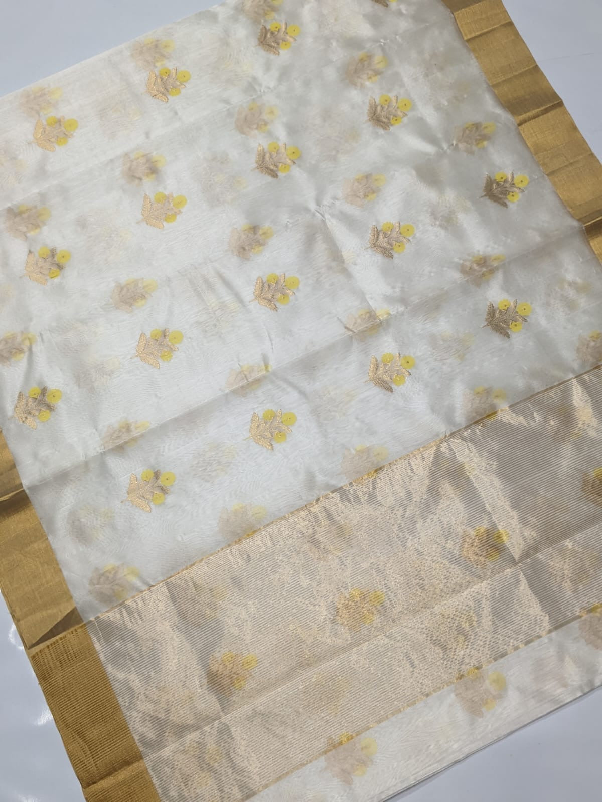 Work - Chanderi silk saree featuring thread zari buta The border is a rich gold zari with intricate floral and geometric patterns, and the pallu is also heavily adorned with similar elaborate gold zari work.